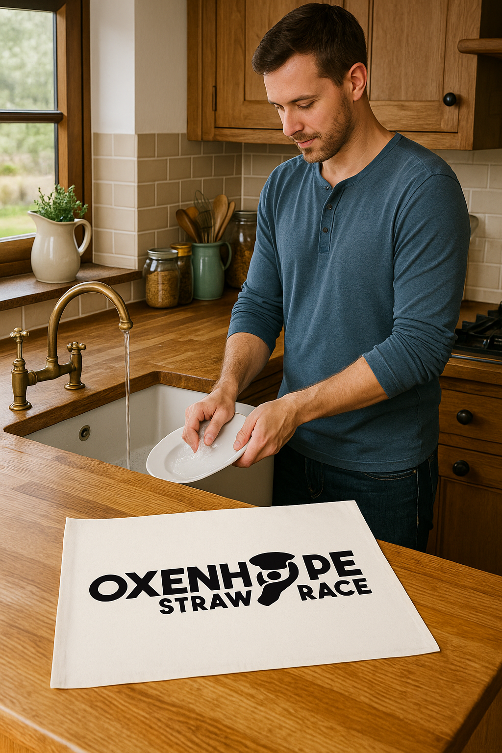 Wipe up spills and raise some smiles with the official Oxenhope Straw Race Tea Towel! Featuring the eye-catching race logo, this quality cotton towel is a practical kitchen essential with a proud Yorkshire twist.